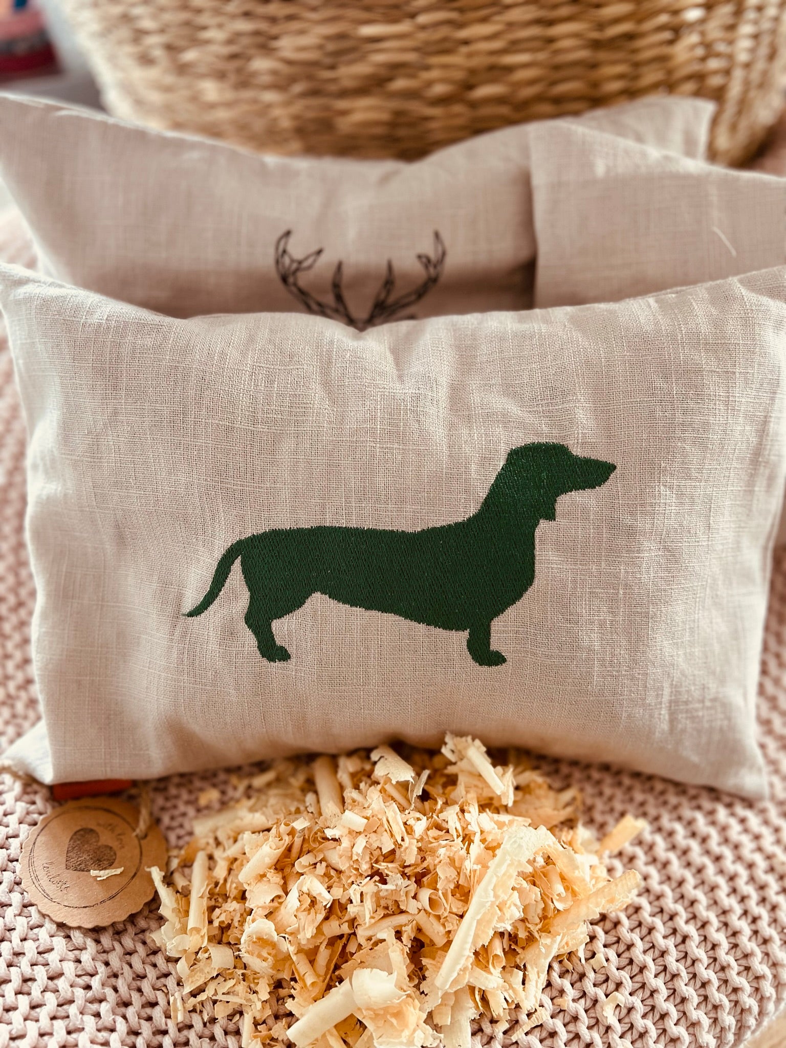 Hochwertiges Zirbenkissen bestickt mit einem süßen Dackel.